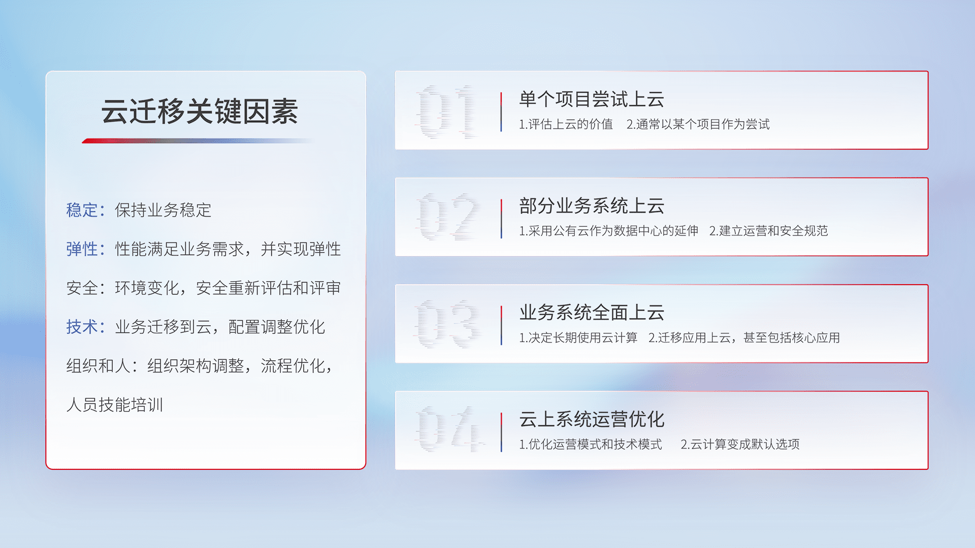 结合实际业务,,,从规划设计、、、云平台选型、、、、云原生改造、、、、数据迁移、、、集成交付,,,迁移全过程为客户识别最佳上云路径,,,做好风险识别管理,,设计网络架构、、身份权限、、、安全审计合规、、操作审计、、日志审计、、监控告警策略、、、、多站点容灾设计等,,对云上基础设施进行整体规划,,,,提升IT治理水平,,以满足弹性、、高可用、、、、高性能的需求。。。