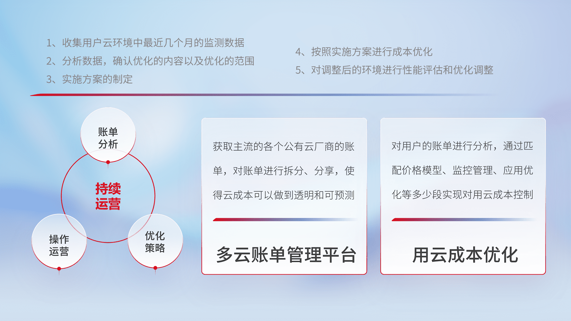 通过多云纳管,,,,以统一的资源数据模型把客户的云资源进行抽象和封装,,,进而实现对多云资源的统一操作,,,,保障云资源管理的可靠性、、稳定性与可用性。。。量身定制化运维内容,,,配置、、、、开发运维、、、补丁管理、、、备份、、、、监控、、认证和访问管理、、、、审计和日常巡检等,,保障在用云过程中的可靠度,,,稳定度以及高可用率。。